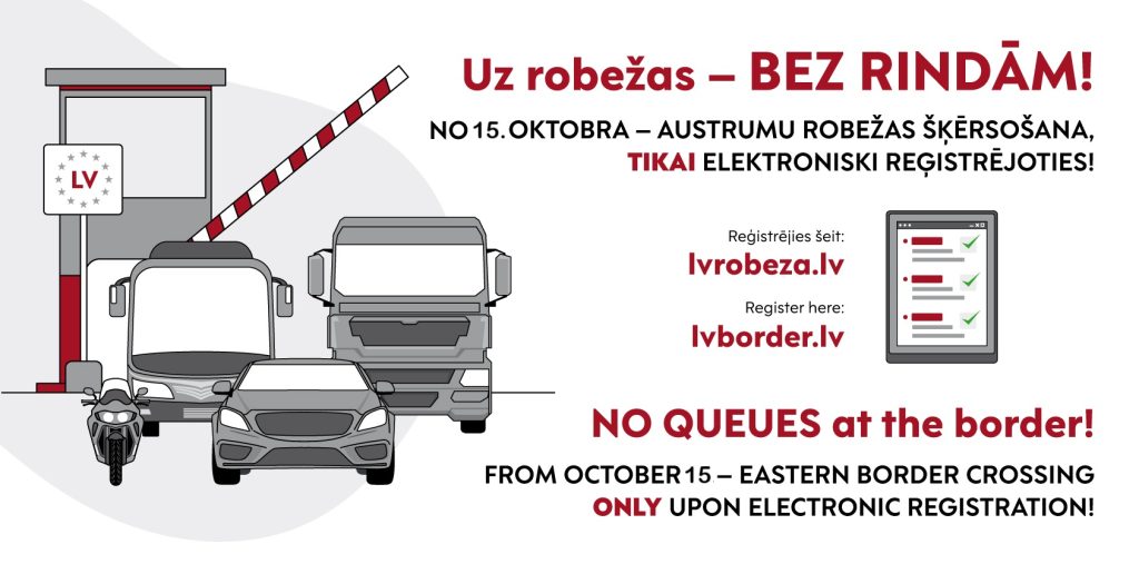 No 2025. gada 15. oktobra transportlīdzekļi bez reģistrēšanās Elektroniskās rindas rezervācijas sistēmā šķērsot Latvijas Republikas austrumu robežu nevar – tas nozīmē, ka “dzīvajā” rindā šķērsot robežu vairs nav iespējams.