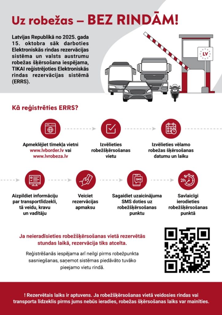 Lai uzlabotu robežšķērsošanas drošību un novērstu auto transporta rindas uz Latvijas austrumu robežas, no 2025. gada 15. oktobra šķērsot Latvijas–Krievijas un Latvijas–Baltkrievijas robežu Grebņevā, Terehovā un Pāterniekos varēs, tikai iepriekš reģistrējoties Elektroniskās rindas rezervācijas sistēmā (ERRS). Līdz ar jaunās rindas rezervācijas sistēmas ieviešanu Latvijā šāda austrumu robežas šķērsošanas kārtība darbosies visās trīs Baltijas valstīs. Reģistrēt transportlīdzekli elektroniskajā rindā varēs robežas šķērsošanai no 15. oktobra varēs jau no šodienas – 1. oktobra interneta vietnēs www.lvborder.lv un www.lvrobeza.lv.